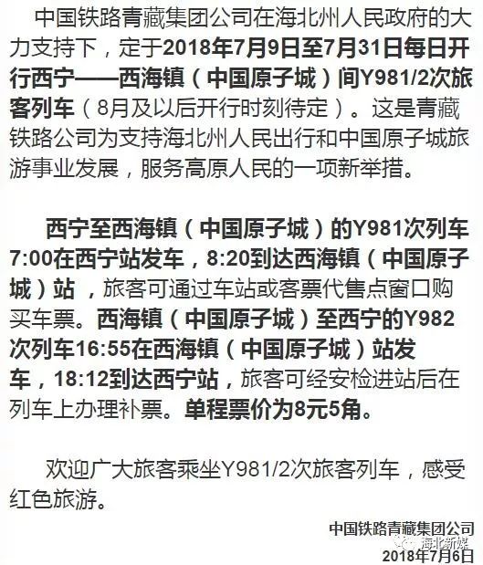 中国铁路青藏集团公司在海北州人民政府的大力支持下,定于2018年7月9日至7月31日每日开行西宁-西海镇(中国原子城)间Y981/2次旅客列车,8月以后开行时刻待定。