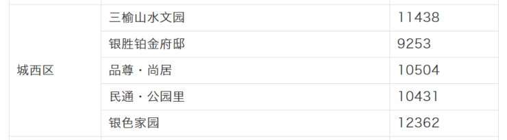 城西区最畅销的楼盘是三榆山水文园、银胜铂金府邸、品尊·尚居、民通·公园里以及银色家园,网签均价分别为11438元/㎡、9253元/㎡、10504元/㎡、10431元/㎡和12362元/㎡。