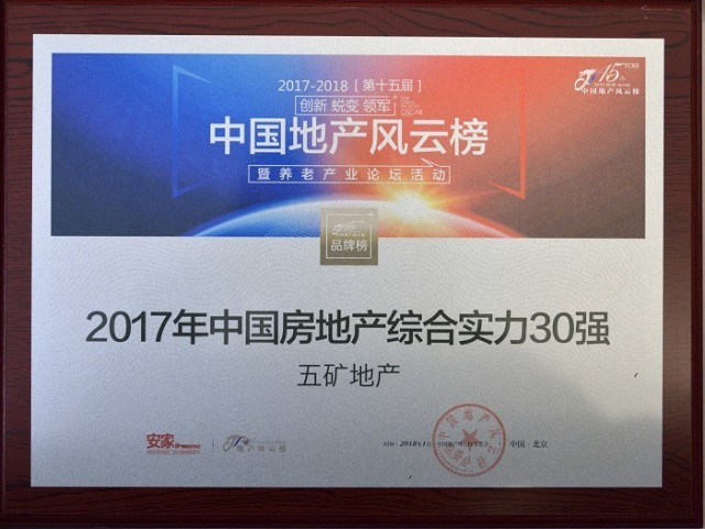 1月26日,“第十五届中国地产风云榜”在北京人民大会堂圆满落幕,五矿地产凭借强劲的综合实力获评“中国地产风云榜”2017年中国房地产综合实力30强企业。