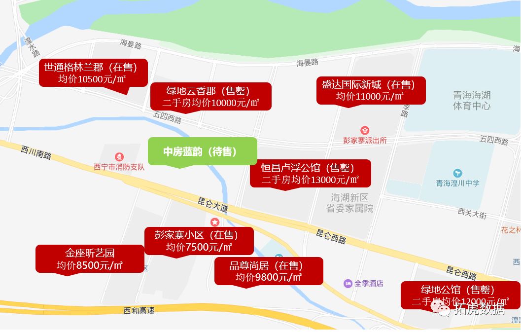 海湖新区的商业发展,可以说是西宁商业市场的标杆,万达、唐道、新华联等一批综合体的开发,创造了西宁市商业发展的新篇章。而目前海湖新区的商品住宅市场,更是“一房难求”。在售楼盘不多,而已售罄的楼盘价格也多在10k+。目前海湖新区的商品住宅市场主要活跃于通海桥以西,即海湖新区的西部边界区域,区域住宅楼盘的销售均价基本在10000—13000元/㎡。