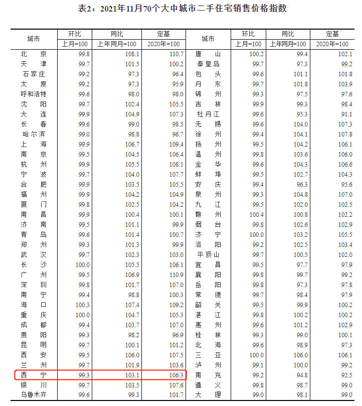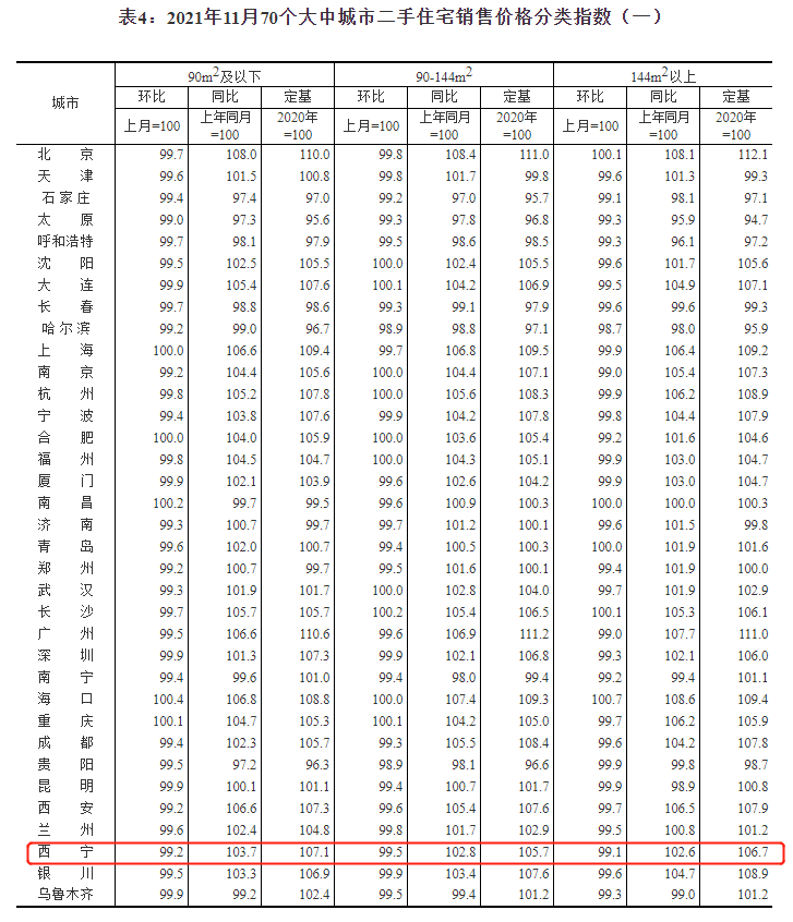 12月15日,国家统计局发布了《2021年11月份70个大中城市商品住宅销售价格变动情况》,其中,西宁市新建商品住宅销售价格环比下降0.5%,涨幅比上月回落0.2个百分比;同比增长5.5%,涨幅相比上月回落1.1个百分点。