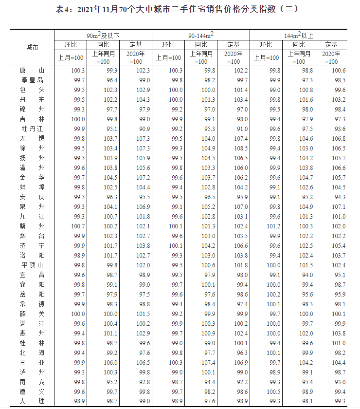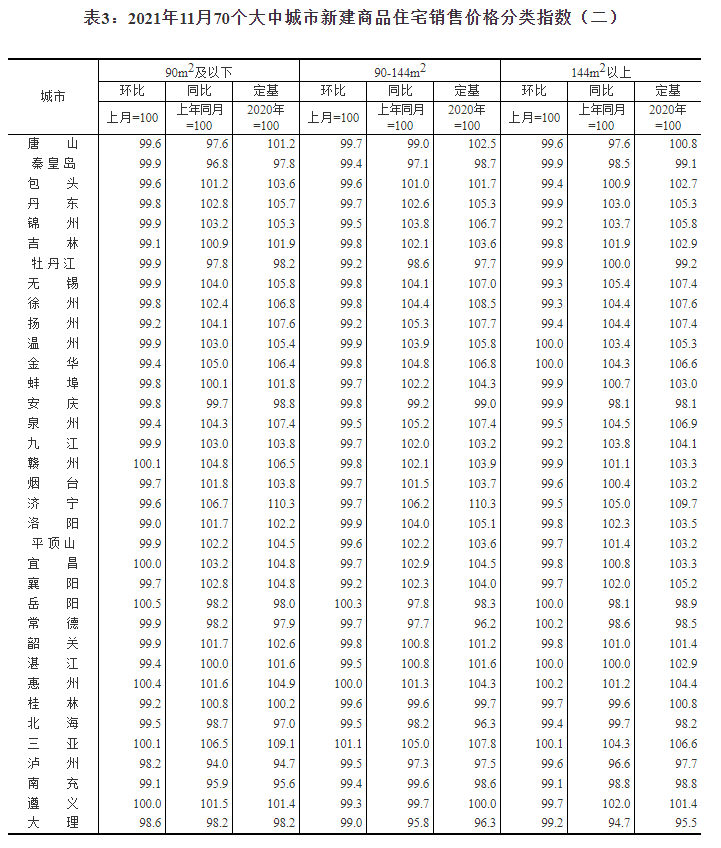 三、11月70个大中城市新建商品住宅销售价格分类指数