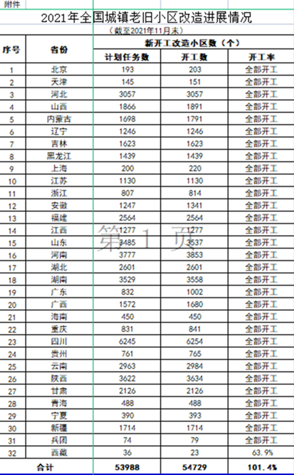 2021年《政府工作报告》提出,新开工改造城镇老旧小区5.3万个。经汇总各地统计、上报情况,2021年1—11月份,全国新开工改造城镇老旧小区5.47万个。分省看,除西藏(63.9%)外,其余30个省、区、市及新疆生产建设兵团全部完成年度计划。